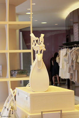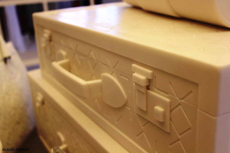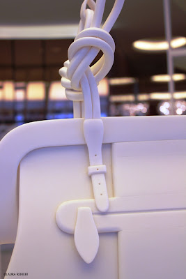 L’head quarter milanese del brand – situato in piazza San Babila 5, cuore pulsante della città – ospita oggi una “rappresentazione” in cui le borse reali delle collezioni ALV Ready to Wear e ALV Ready to Travel convivono con valigie e borse realizzate interamente a mano in HI-Mac’s da esperti artigiani. Forgiando con il calore la pietra, che ha una malleabilità paragonabile al cristallo, gli artigiani sono riusciti a realizzare degli esemplari in tutto e per tutto identici – per proporzioni, rilievi, cerniere – agli originali delle collezioni ALV, arrivando persino a riprodurre, dopo numerosi tentativi, i nodi della borsa-icona San.Ba.