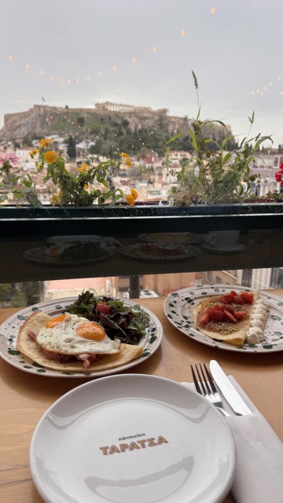 Un rooftop elegante e un po’ nascosto all’ultimo piano: bisogna salirci apposta, ma appena arrivi capisci subito che vale assolutamente la pena, soprattutto per la splendida vista sull’Acropoli. Il design è contemporaneo, luminoso, curato nei dettagli — il luogo perfetto per una pausa chic e rilassata nel cuore della città. Taratsa propone brunch fino alle 14:00, con piatti freschi, creativi e ben presentati; dopo questo orario si passa al menù alla carta, ideale per un pranzo leggero o un aperitivo con vista. Il servizio è gentile e discreto, l’atmosfera piacevolmente calma rispetto alla vivacità del centro.