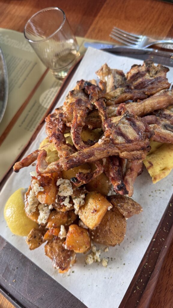 Da non perdere: Pane pita, Fava con cipolle fresche e limone, Feta Atitamos, Filetti di pollo e Costolette d’agnello servite con pita e patate