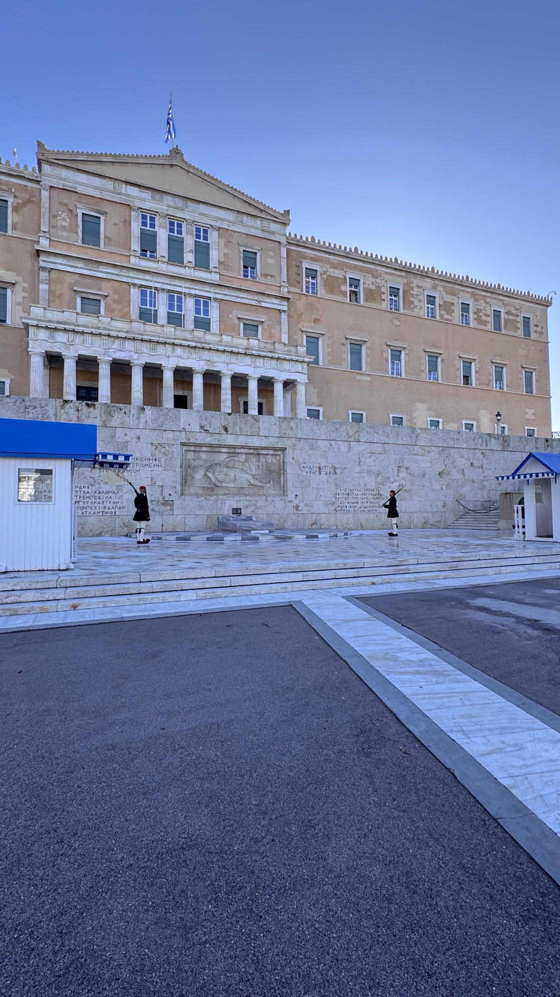 La giornata inizia in Piazza Syntagma, cuore istituzionale della città. Il cambio della guardia davanti al Parlamento ellenico avviene ogni ora, ma la cerimonia più solenne è quella domenicale delle 11.00, con uniformi storiche e banda militare.