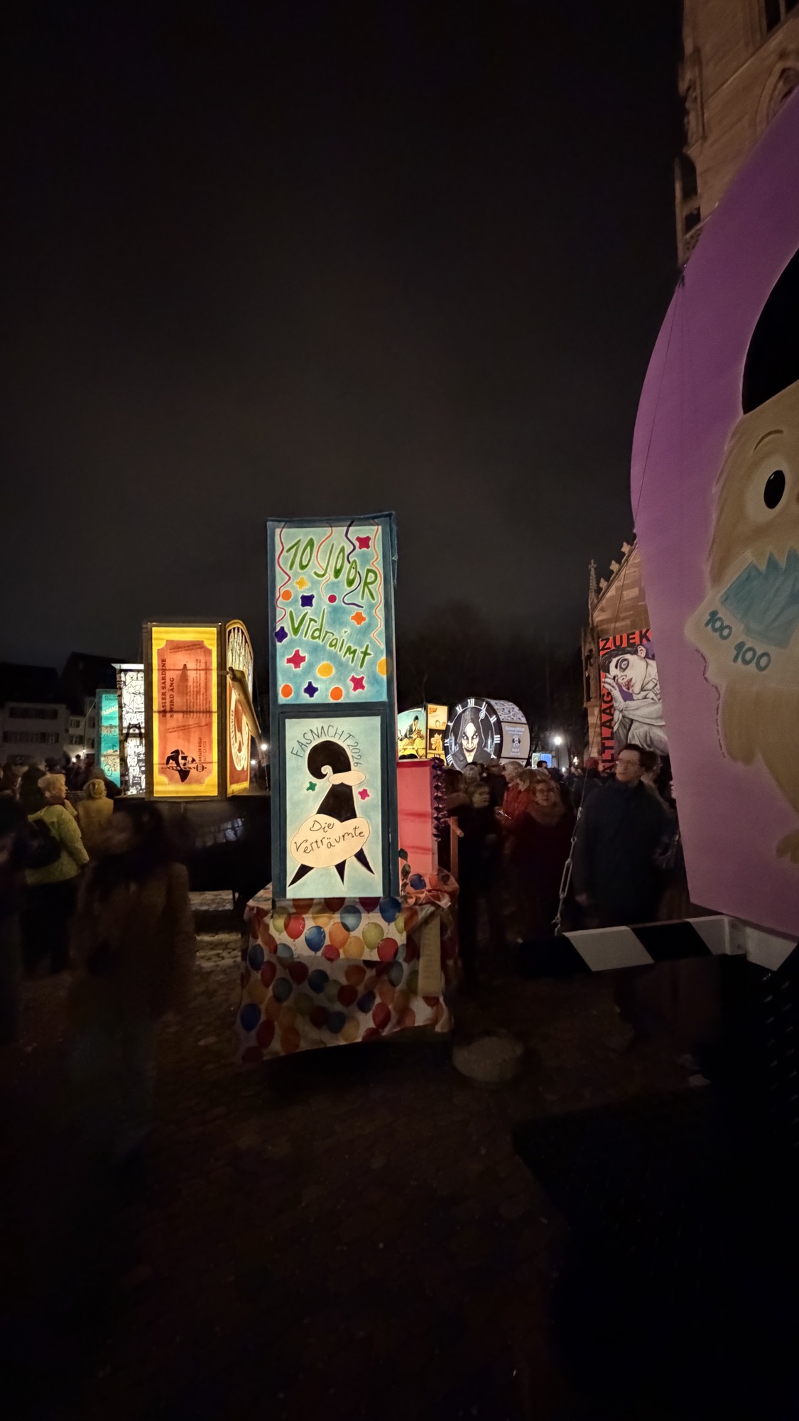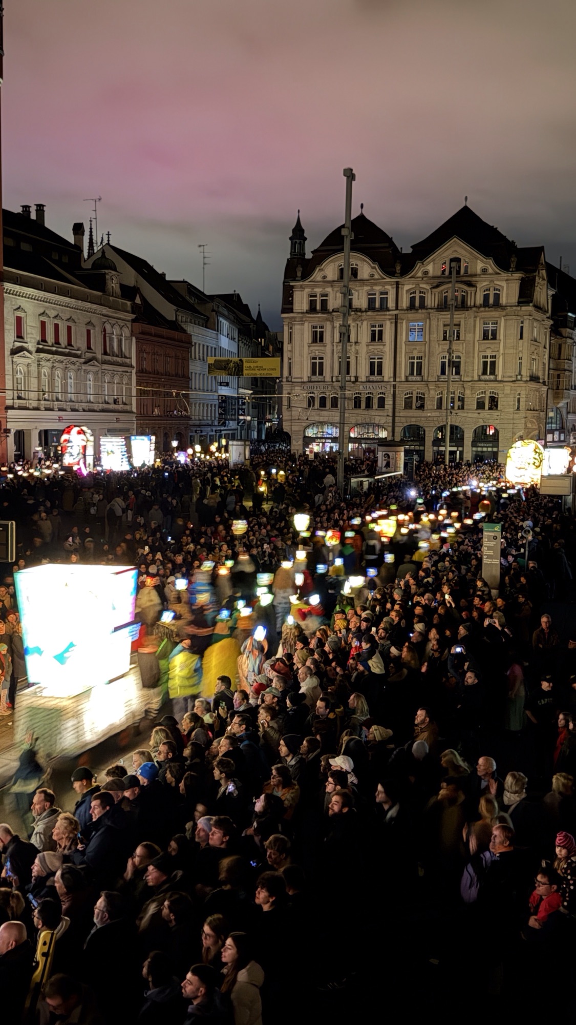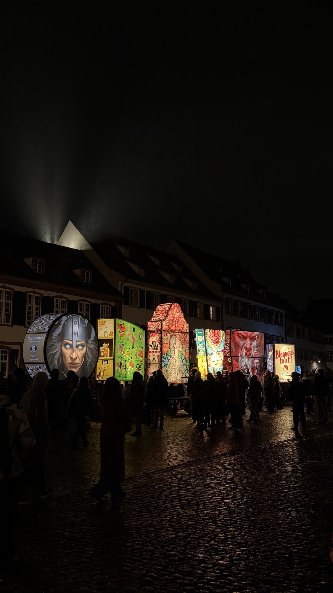 As night falls, the Carnival changes tone once again. On Münsterplatz, the Fasnacht lantern exhibition takes shape, considered one of the largest temporary open-air art exhibitions in the world. More than two hundred illuminated lanterns are displayed, observed up close, read, and interpreted.