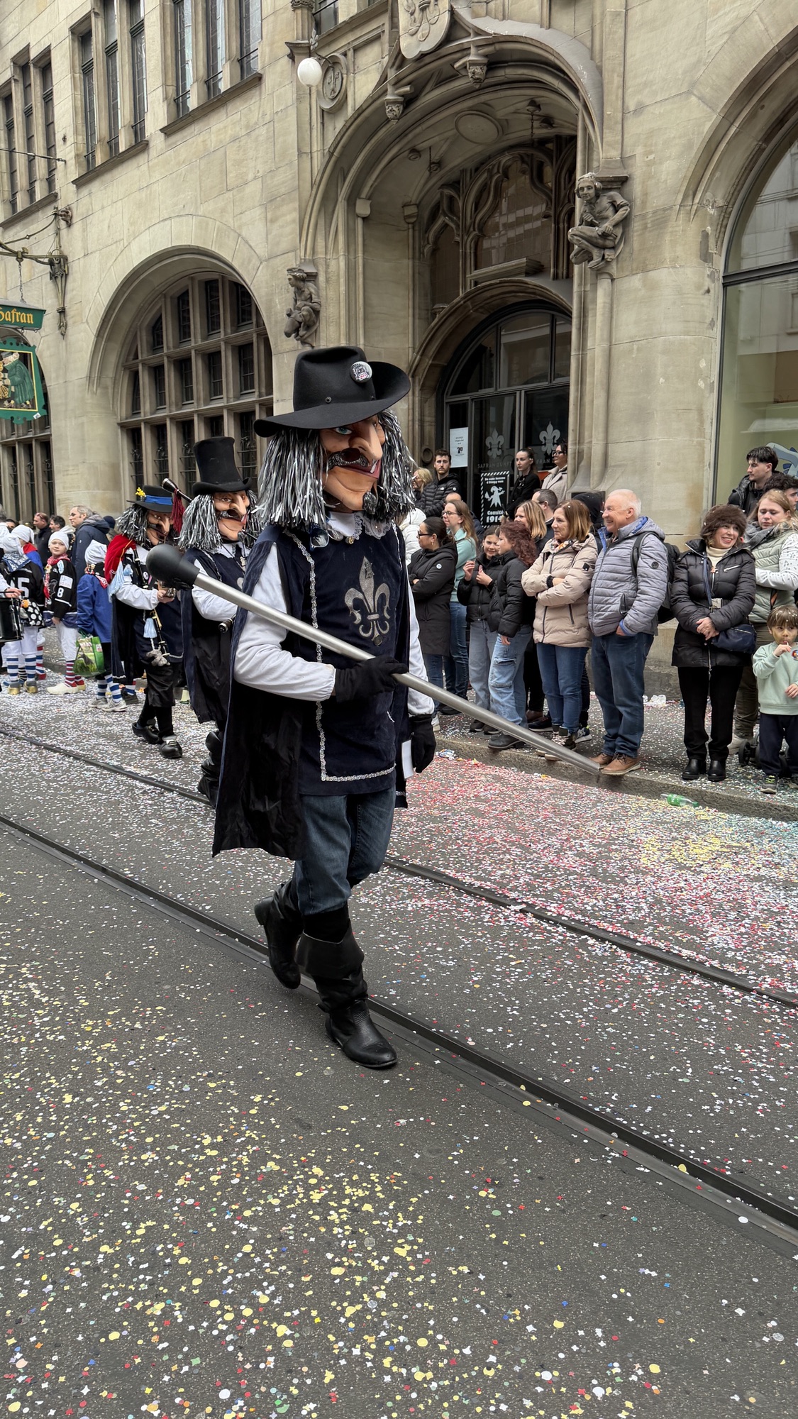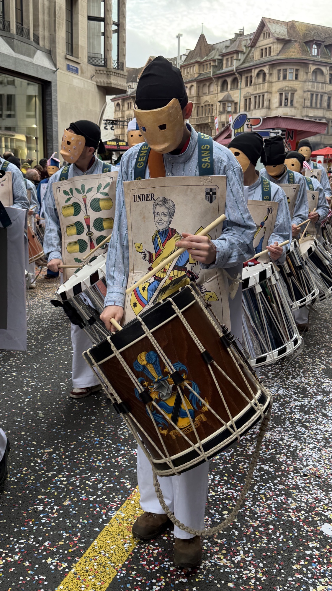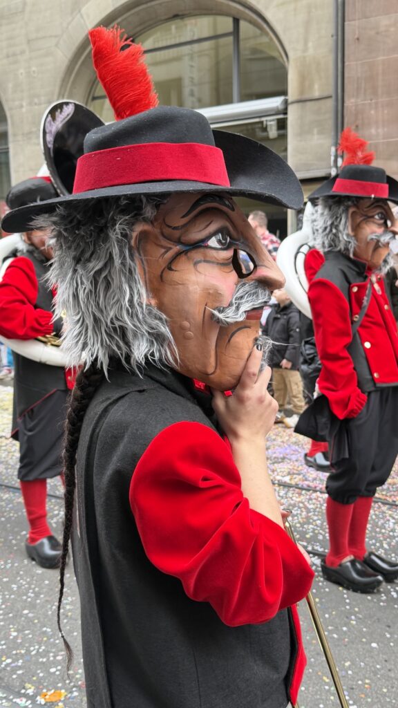 Here too, nothing is left to chance: marching order, rhythm, and distances are followed with precision. The confetti, known as Räppli, are not decorative but part of the Fasnacht’s visual language. Each clique uses a specific colour, and only those marching are allowed to throw them. Picking them up from the ground and throwing them back is considered improper. A small detail that clearly reflects how even play follows precise cultural codes in Basel.
