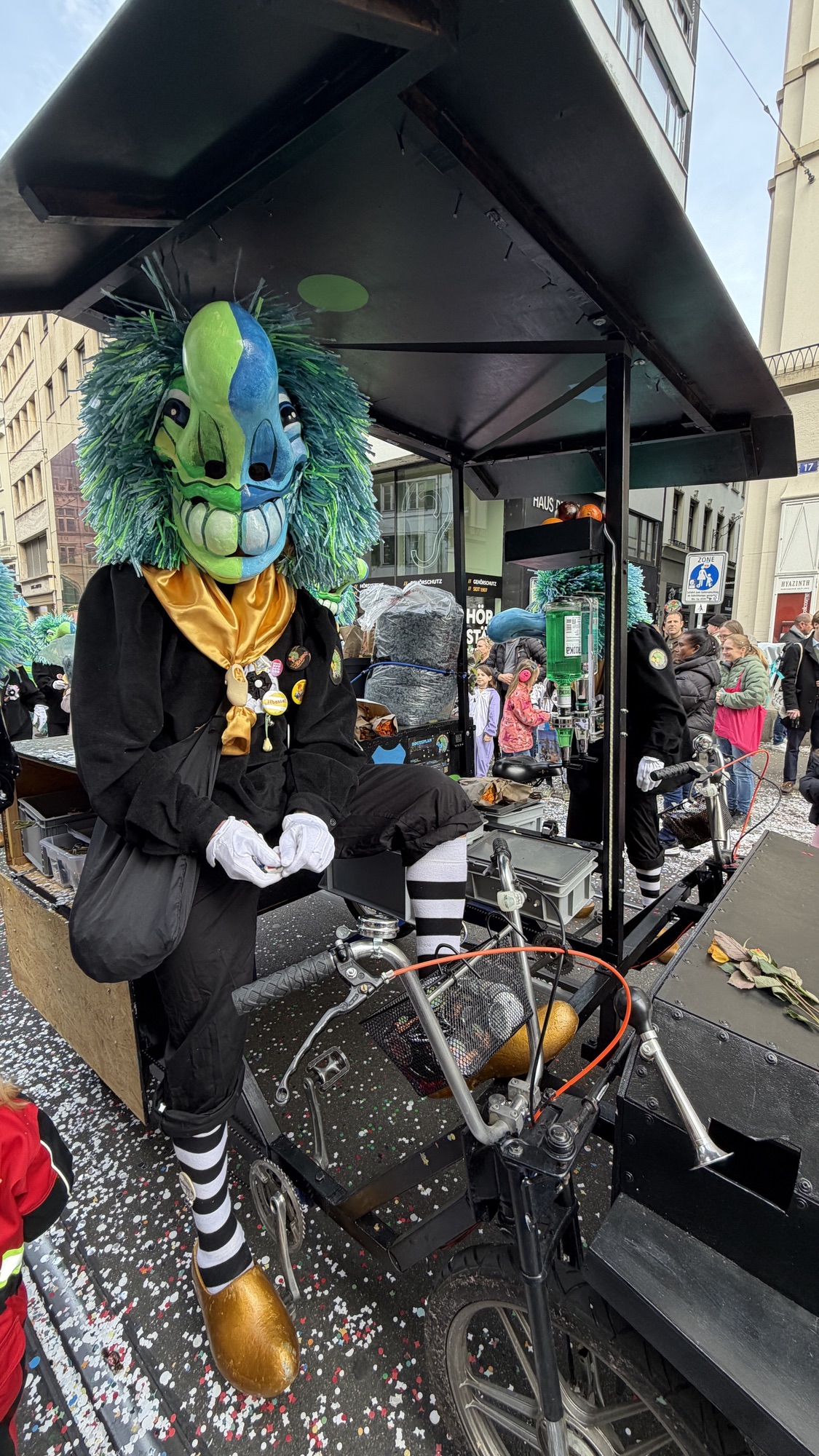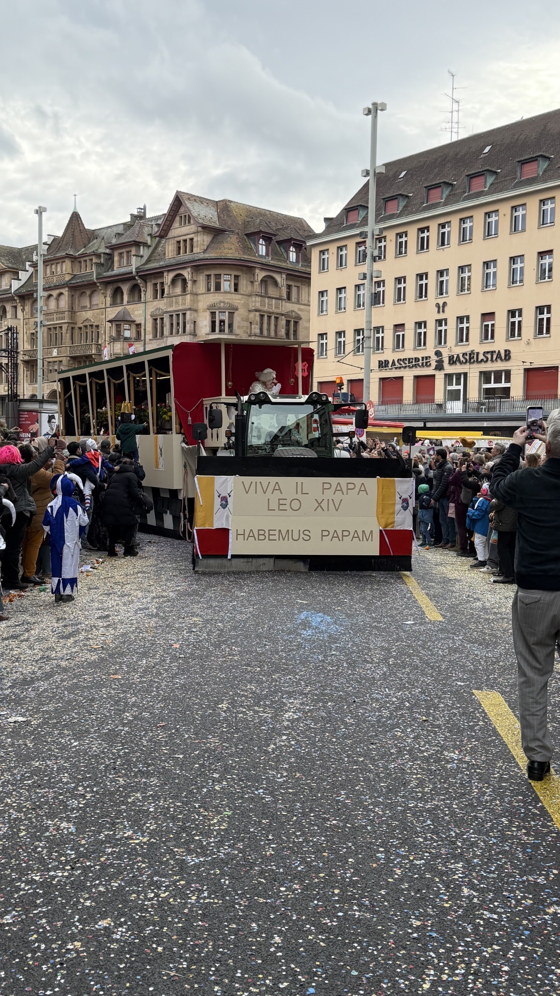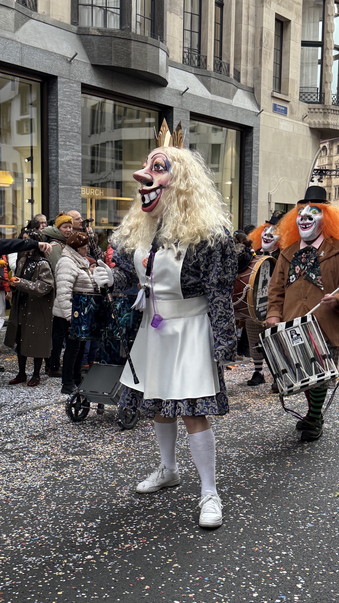 Here too, nothing is left to chance: marching order, rhythm, and distances are followed with precision. The confetti, known as Räppli, are not decorative but part of the Fasnacht’s visual language. Each clique uses a specific colour, and only those marching are allowed to throw them. Picking them up from the ground and throwing them back is considered improper. A small detail that clearly reflects how even play follows precise cultural codes in Basel.