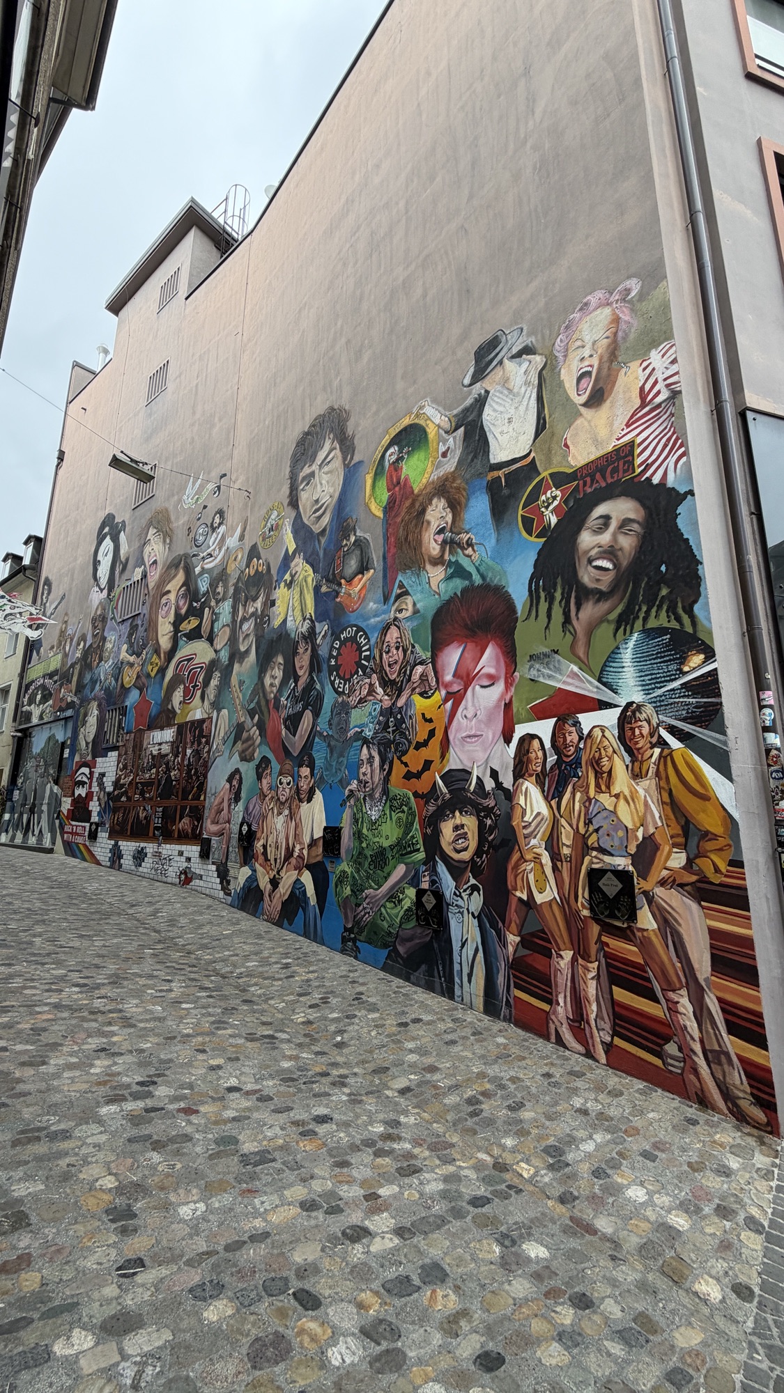 In the early afternoon, a brief stop at Basel’s most iconic rock’n’roll mural adds a contemporary, urban note. It is a quick but telling detail, showing how street art also finds its place in this carefully ordered city.