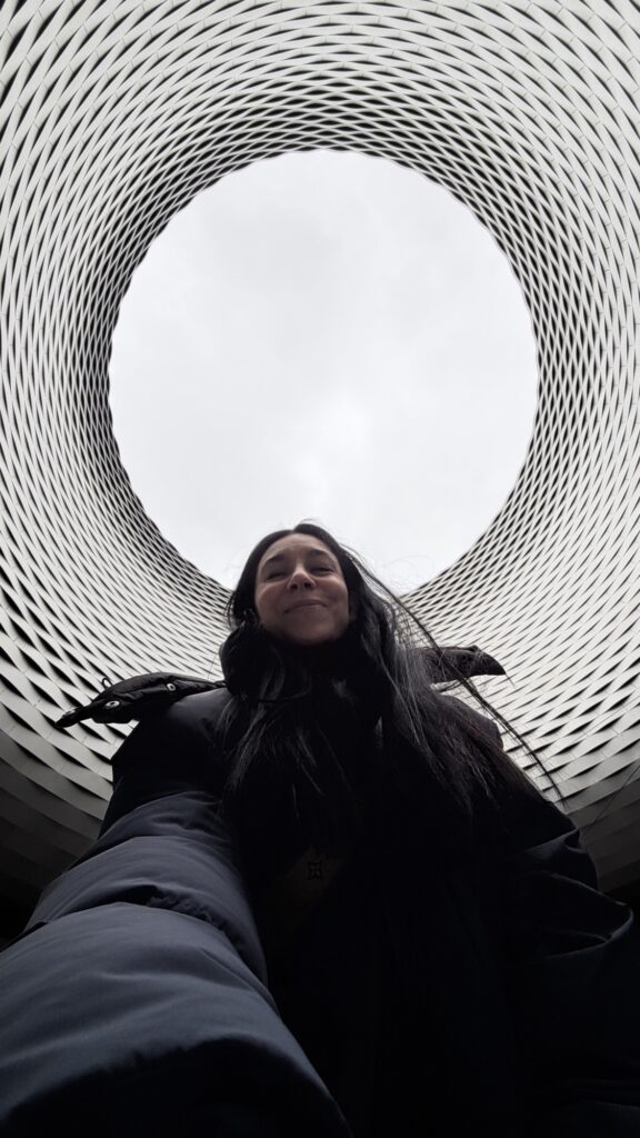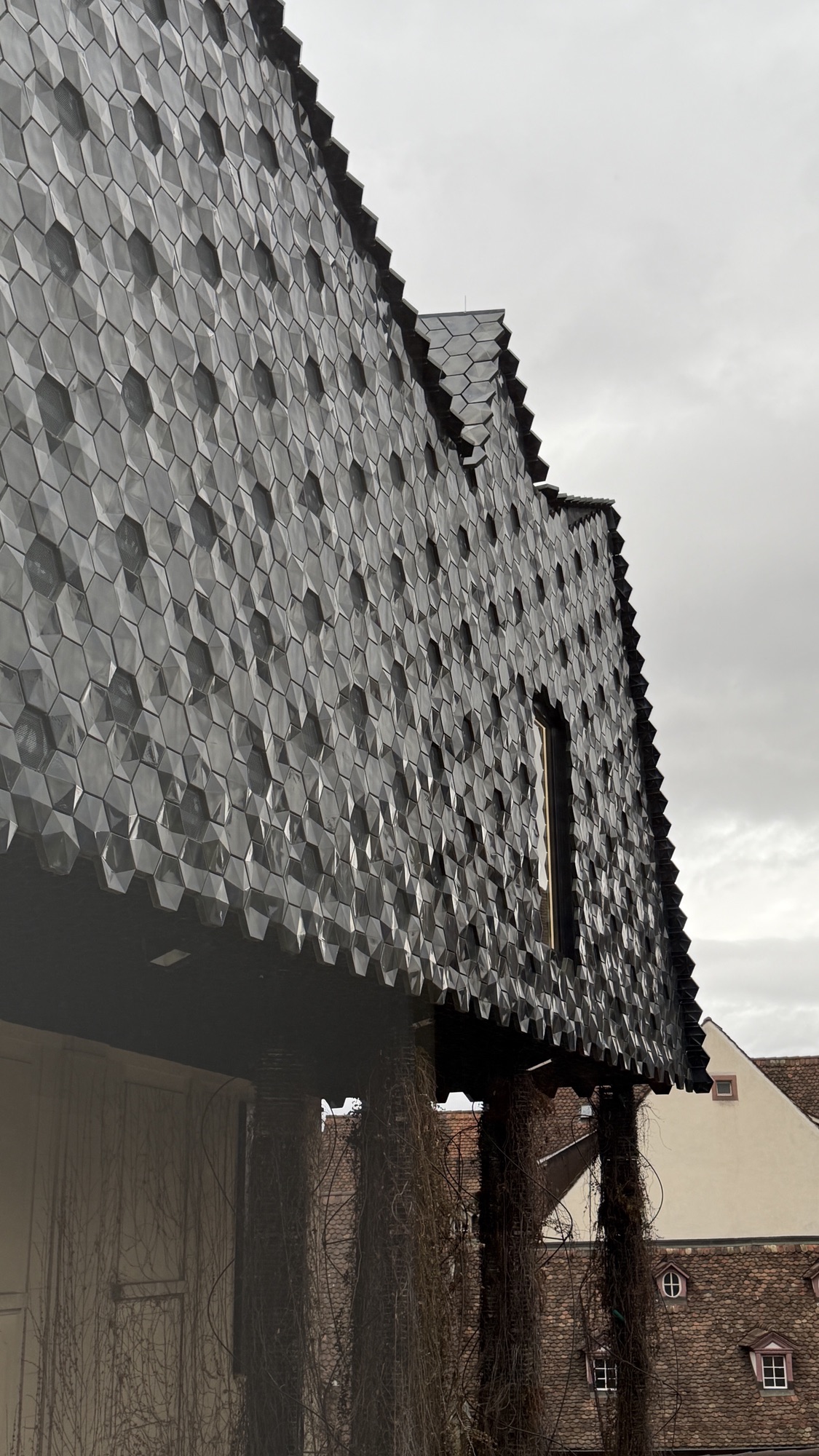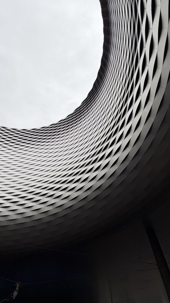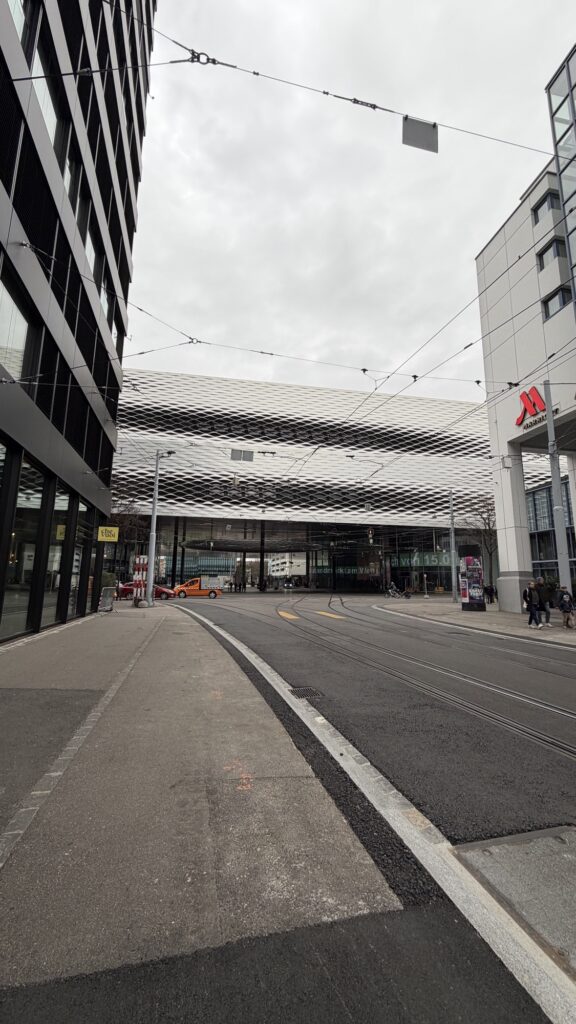 On the way back into the city centre, a short stop beneath one of Basel’s most iconic examples of contemporary architecture. Designed by Herzog & de Meuron, Messe Basel is instantly recognisable for the large circular opening above Messeplatz. Rather than a building to visit, it is an urban space to walk through: the architectural void frames the sky and turns an everyday passage into a striking visual experience.