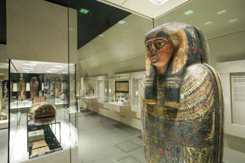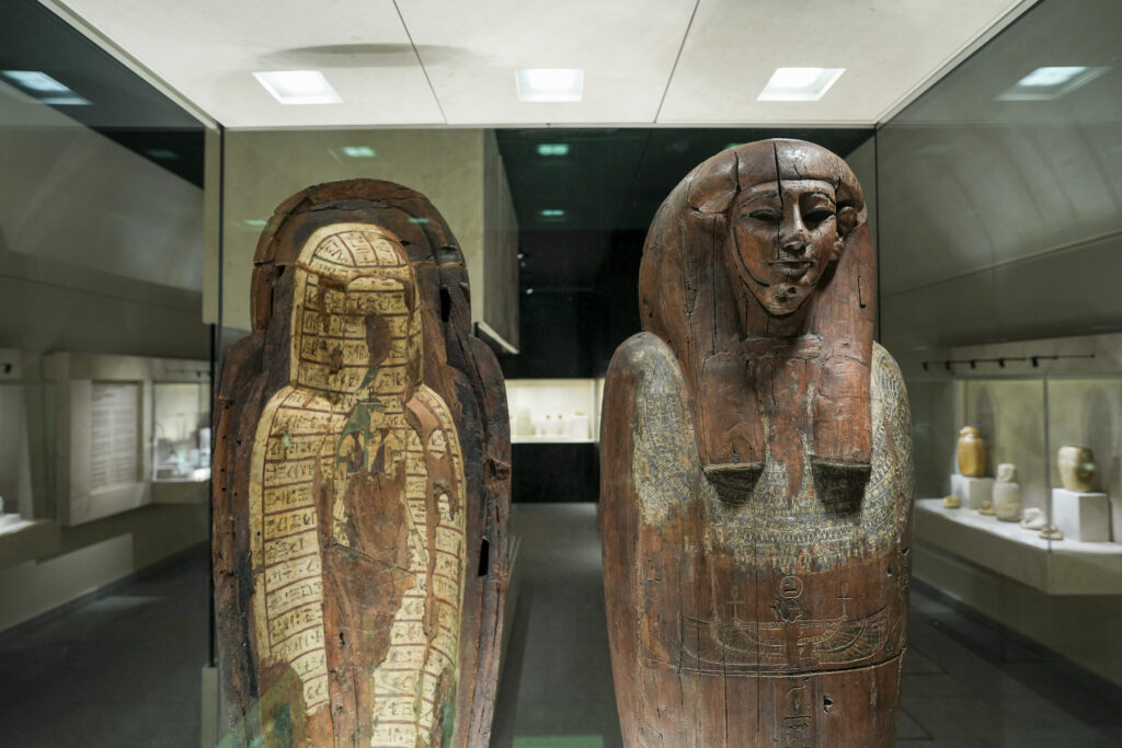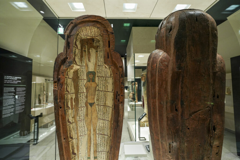 In mostra circa 330 reperti, di cui 80 esposti per la prima volta, che attraversano oltre tremila anni di storia, dal IV millennio a.C. al V secolo d.C. Sarcofagi, papiri, amuleti, bronzetti, vasi canopi e stele costruiscono un racconto articolato della civiltà egizia, restituendone la complessità tra vita quotidiana, dimensione religiosa e visione dell’aldilà.
