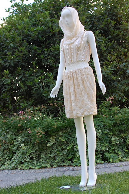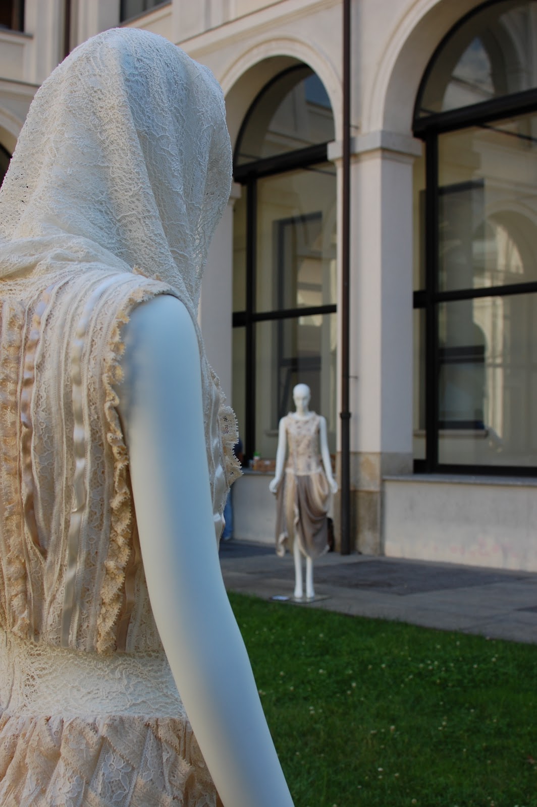 Blanc pétillant , e’ realizzato attraverso l’intreccio di strisce di pizzo e di raso, che formano un tessuto, al tempo stesso, composto e decomposto. Il suo “velo” copricapo ci consente di fare un viaggio tra la modernità occidentale e la tradizione orientale. Il copricapo è l’elemento di trasformazione dell’abito, può essere indossato come velo o come collo importante. Un elemento di religiosa dedizione, o di mondana frivolezza. Due modi di vedere la stessa sostanza.