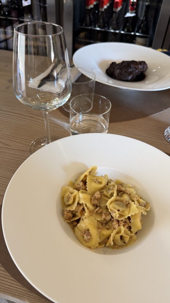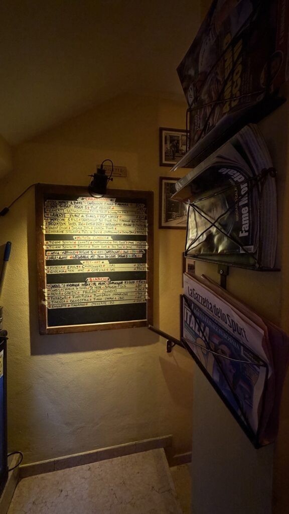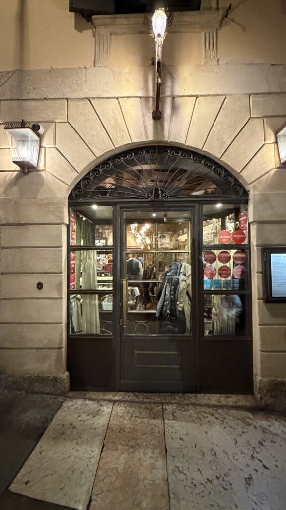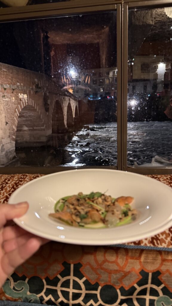 La giornata si chiude con la cena all’Osteria Ponte Pietra, a pochi passi dall’omonimo ponte. È uno di quei luoghi che funzionano perfettamente alla fine di un itinerario come questo: raccolto, coerente con il contesto e senza forzature. Qui l’esperienza è legata alla cucina veronese, con piatti che mantengono un legame diretto con il territorio. La posizione, vicina al fiume e lontana dal flusso più intenso del centro, contribuisce a creare un momento più disteso rispetto al resto della giornata. Dopo una giornata interamente a piedi, è la chiusura naturale: si rallenta, si resta, senza la necessità di spostarsi ancora.