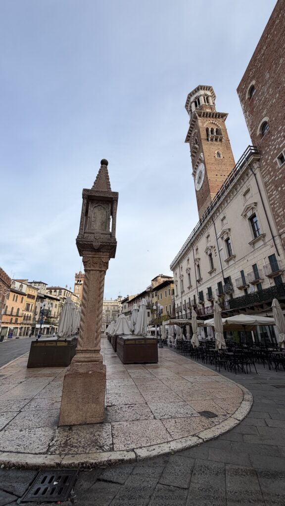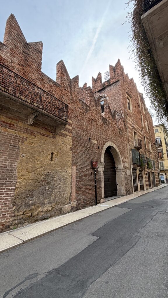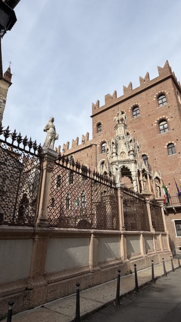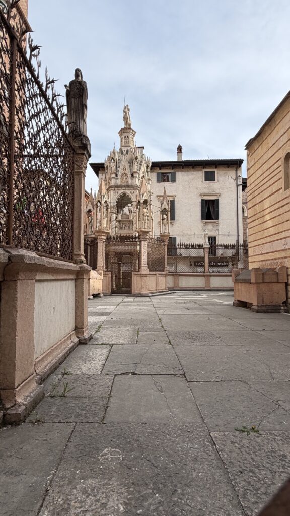 Il rientro attraversa Casa di Romeo, edificio medievale oggi riconoscibile soprattutto dall’esterno, dove un’iscrizione richiama la figura di Romeo, mantenendo vivo il legame simbolico con la storia. Poco distante si incontrano le Arche Scaligere, complesso funerario monumentale della famiglia Della Scala, caratterizzato da strutture gotiche elaborate e da una forte verticalità che le rende immediatamente riconoscibili. È uno dei punti in cui la dimensione storica di Verona emerge con maggiore evidenza, anche in un passaggio breve.