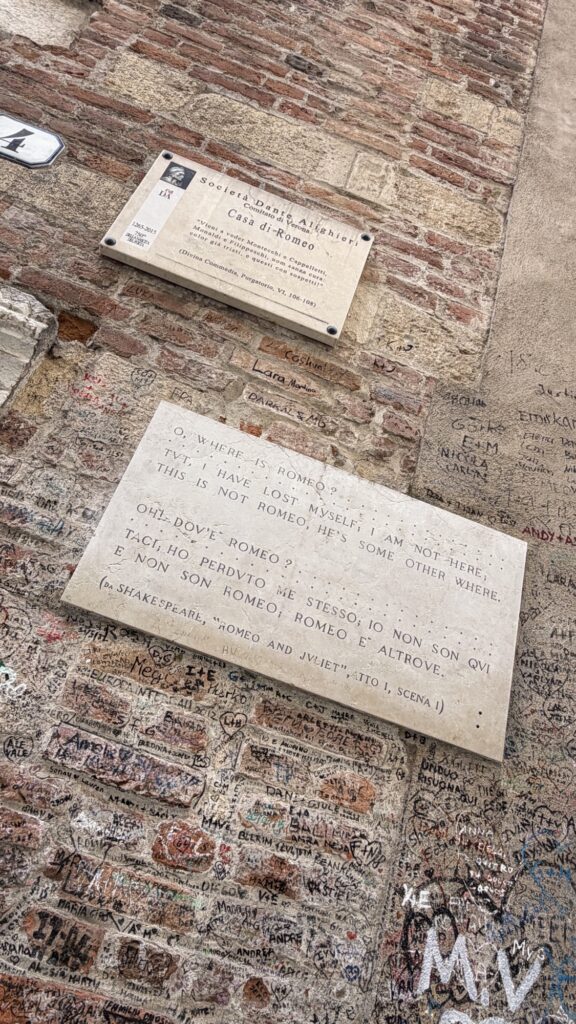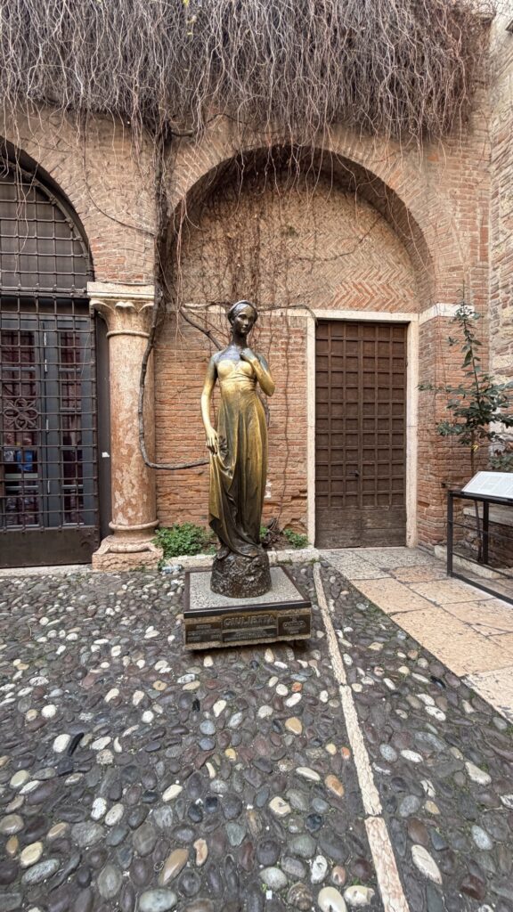 Da qui ti accompagno verso la Casa di Giulietta (Via Cappello, 23), uno dei luoghi più iconici. Si entra in un cortile raccolto, sempre pieno di persone ferme nello stesso punto: lo sguardo va al balcone, ma è la statua a catalizzare l’attenzione. La statua in bronzo di Giulietta è diventata parte integrante dell’esperienza: toccarne il seno destro è considerato un gesto portafortuna, un rito che si ripete continuamente e che contribuisce a rendere questo luogo così vivo e condiviso.